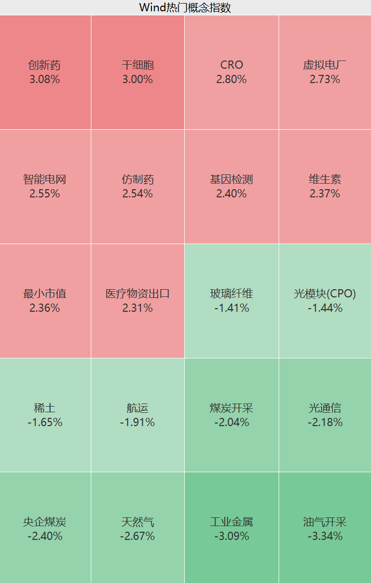 从盘面上看,医药生物、农林牧渔、基础化工等板块表现强势,创新药、CRO、智能电网等概念股较为活跃;而石油石化、海运、煤炭等板块则表现疲软,光模块、稀土等概念股出现走低。