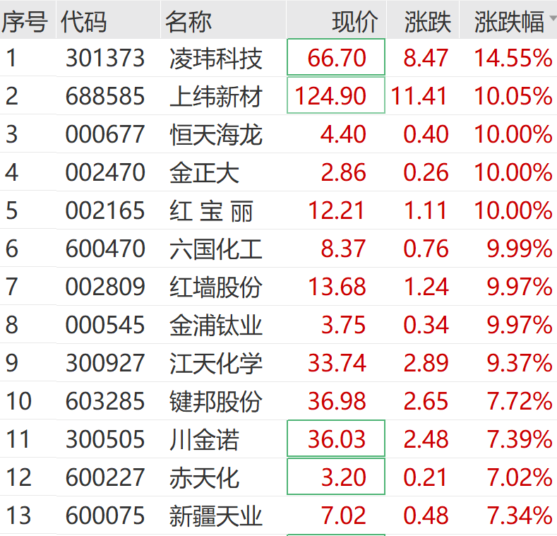 此外,上午基础化工板块在盘中走强,恒天海龙、金正大、红宝丽、六国化工等多只个股涨停。