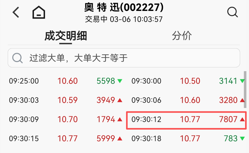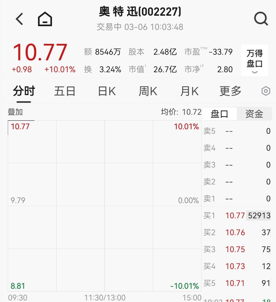 奥特迅在开盘仅12秒后就封住涨停板,股价报10.77元/股。