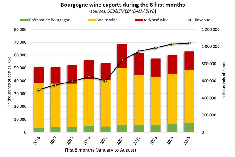 2024年以来勃艮第全球出口逐步恢复,2025年前8个月量额双增。对中国大陆出口虽略有下滑(量降0.9%、额降5.3%,均价下探),但国内需求稳定。