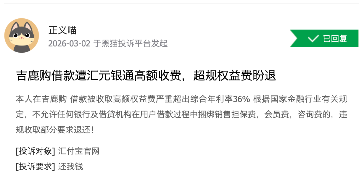 还有用户投诉称,在汇元银通另一家合作平台吉鹿购借款时,被收取的权益费使综合年利率超过36%。
