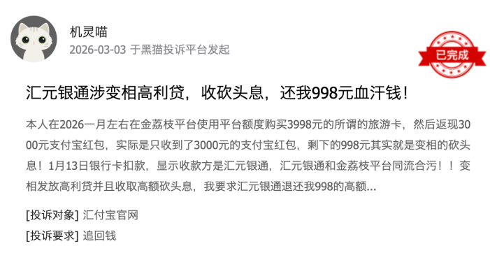有用户投诉称,在汇元银通合作平台金荔枝“购买”3998元旅游卡,仅收到3000元支付宝红包,剩余998元实际上是变相的“砍头息”,被汇元银通直接扣除。