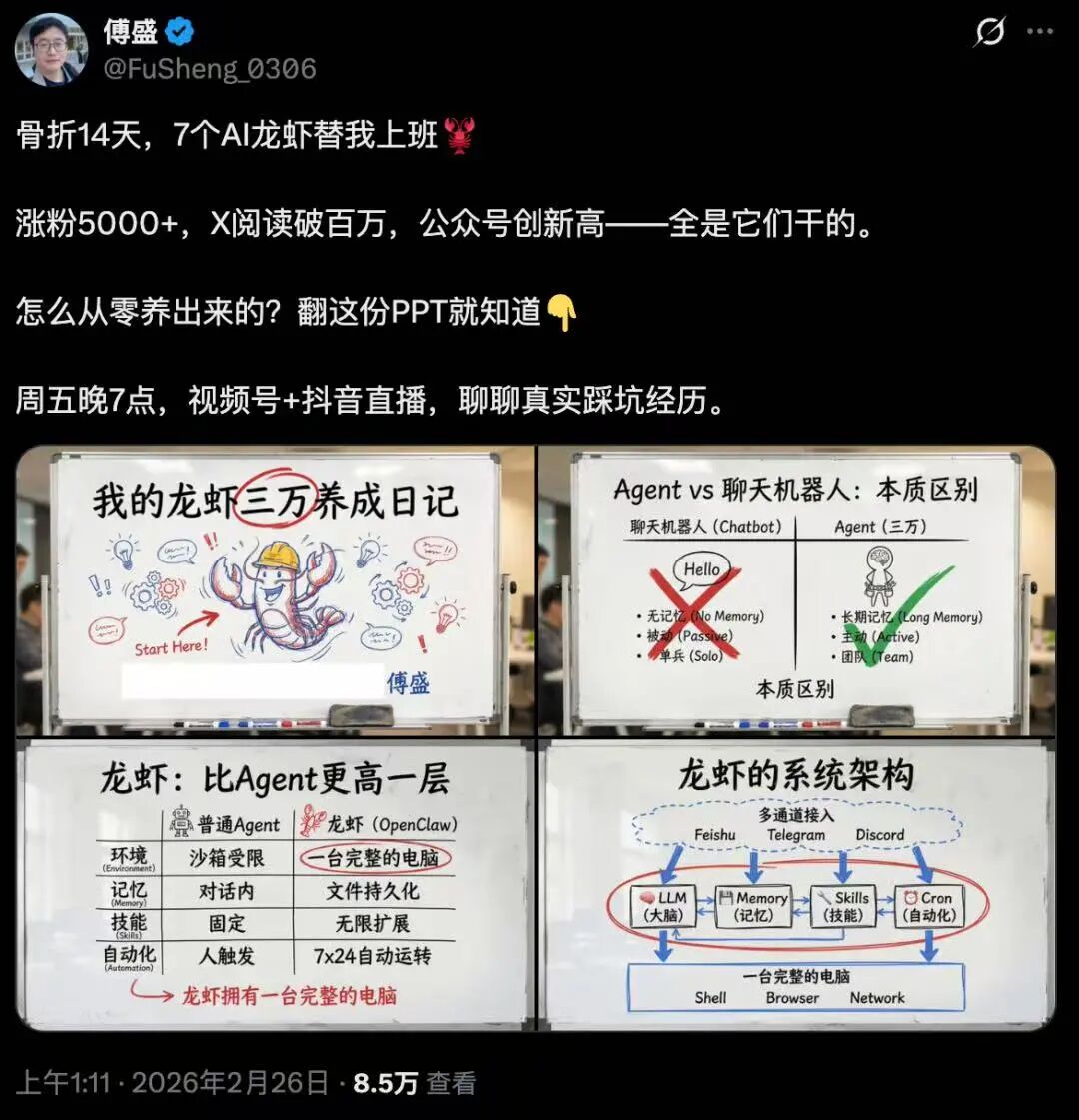 猎豹移动的CEO傅盛发文表示,春节滑雪受伤后,他养了7个AI龙虾,实现了“涨粉5000+,X阅读破百万”的成绩。