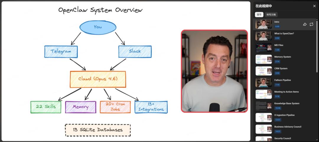 第二类是联系人、会议相关的整理。OpenClaw可以帮你建立联系人系统,从Gmail、会议转录(Fathom)、日历中抓取联系人信息,更新“关系摘要”和最近互动历史。在客户关系方面,还能对会议录音进行转录和整理,自动识别参与者并匹配你的联系人系统。