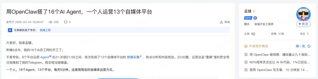 自称前腾讯前端开发工程师的孟健发文称,自己用OpenClaw搭建了16个Agent,晚上让它们一起工作,二十多分钟就完成了“13个自媒体平台的数据采集、热点分析和内容规划”,还能自动推送全局日报。