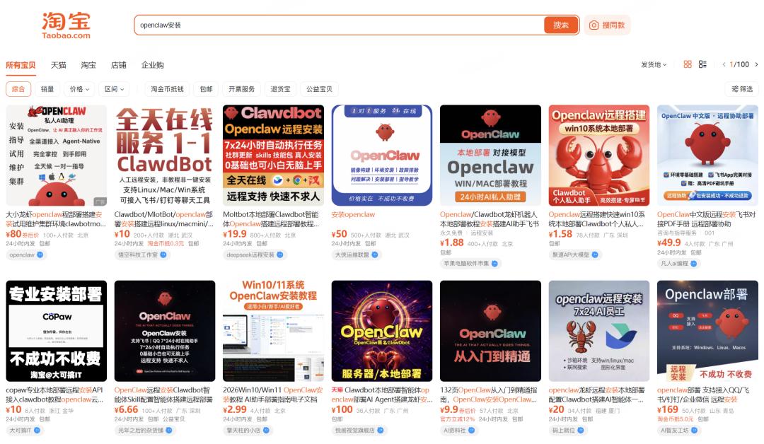 在淘宝、闲鱼甚至小红书上,有很多人提供OpenClaw的上门或远程安装服务,价格从几十元到上万元不等,不过大多集中在100-200元之间。