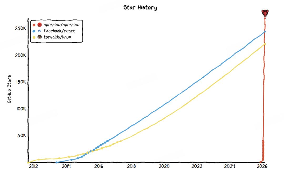 这个在今年春节期间突然爆火的开源项目,上线仅一周,在Github上的星标数就突破了10万。目前,OpenClaw的星标数已经达到26.7万,超过了React的24.3万,成为GitHub上获星最多的软件项目。从诞生到登上GitHub榜首,OpenClaw只用了短短4个月。
