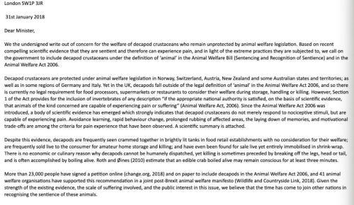 2018年,甲壳纲动物关怀协会曾联合动物福利组织请愿将龙虾、螃蟹纳入《动物福利法》。