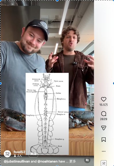 视频截图:社交网站上,人们宰杀龙虾前学习其身体构造。