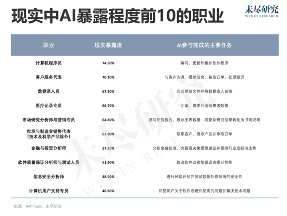 从职业层面观察,可按任务在工作时间中的占比加权,估算职业中可能被AI覆盖的工作比例。结果显示,程序员现状最“危险”,其次是客服代表、数据录入专员和医疗记录专员等。这项实证研究印证了已知观点:高学历、高收入白领工作者最易受AI影响。不过与OpenAI理论推演略有不同,当时连央行专家都进入前10名。