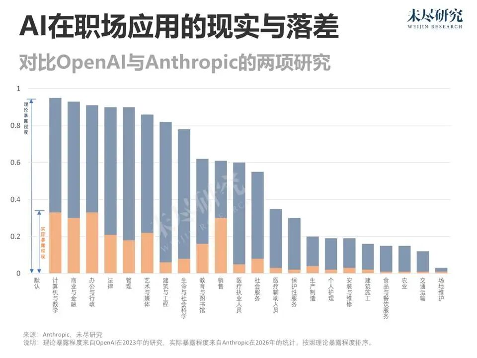 如今,大模型能力显著提升。包括GPT-5.4在内,模型已整合推理、编码和智能体工作流,逐渐具备操作计算机的能力;Anthropic旗下的Claude Code更是在推动白领行业变革。这意味着仅靠理论推演估算AI对就业的影响,已越来越难反映真实情况。