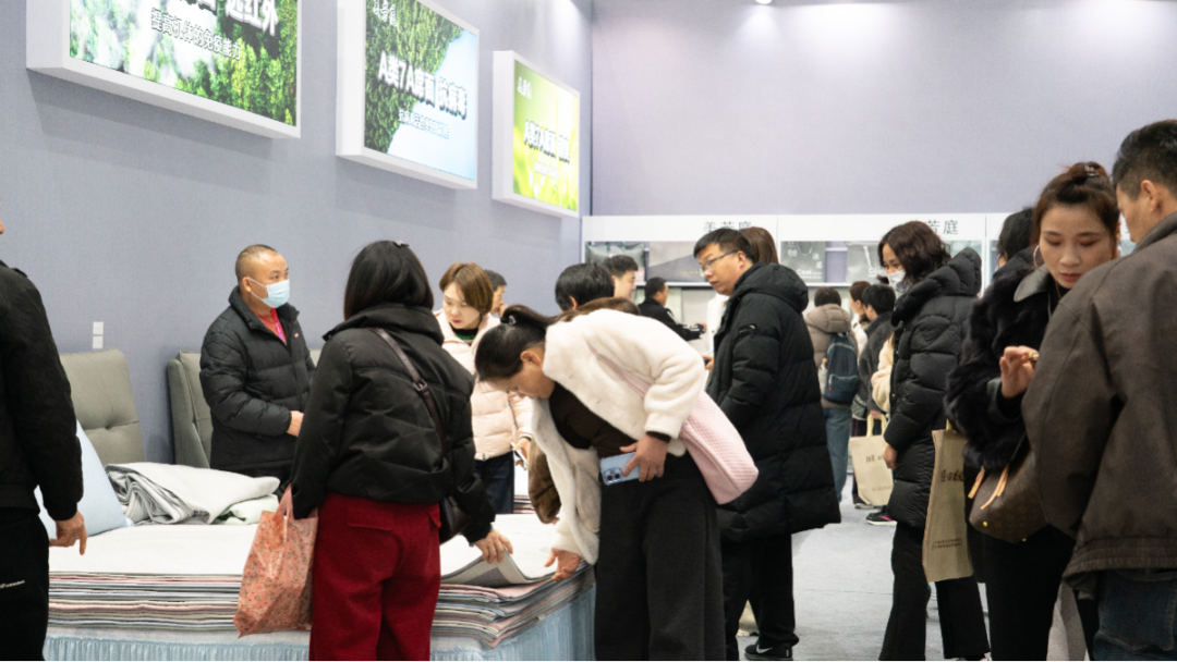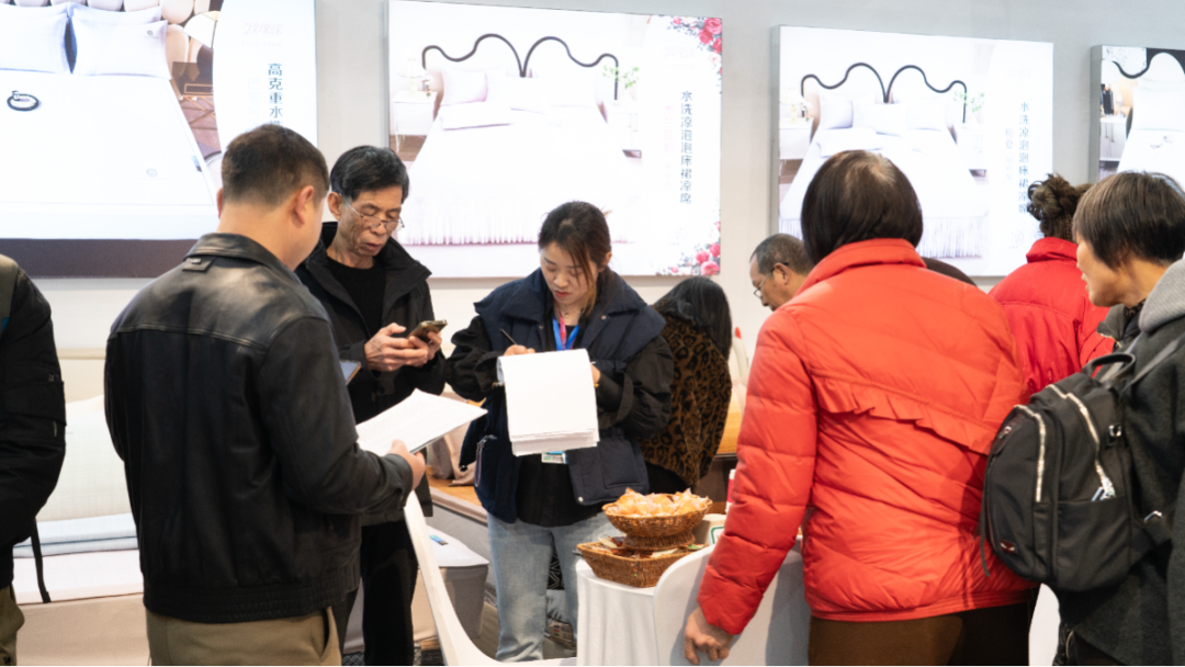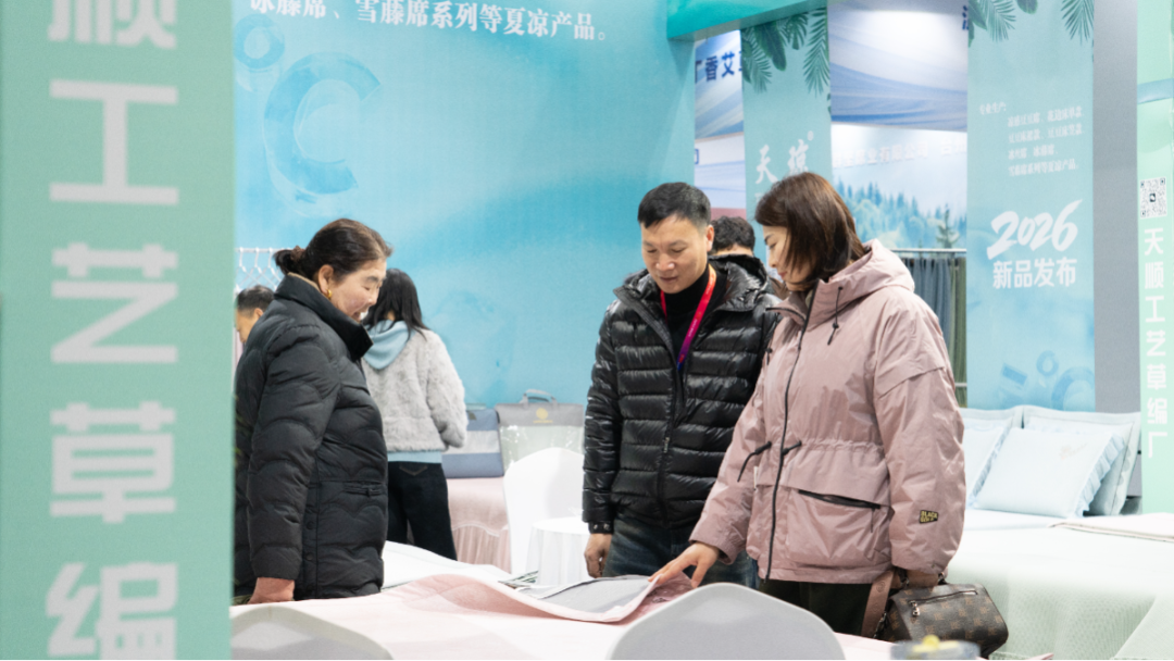 “玫瑰缘”展位前围满咨询客商,负责人彭桂莲一边介绍产品,一边添加客户联系方式。她表示,企业深耕凉席行业20余年,生产基地位于江西南昌,是展会的“老面孔”。“今天开场没多久就拿下一笔五六万元的订单,开局比预期好,已有不少客商留下联系方式,后续会推进合作。