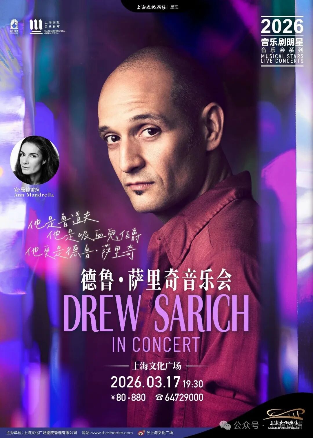 3月17日,《音乐剧明星德鲁·萨里奇音乐会》将融合西区、百老汇与德语经典。曾两度亮相文化广场的德鲁·萨里奇,凭借独特嗓音和戏剧张力的舞台表现,给中国观众留下深刻印象。此次他将与出演过《贝隆夫人》《蜘蛛女之吻》的音乐剧明星安·曼德雷拉合作,回顾其舞台生涯的经典作品。