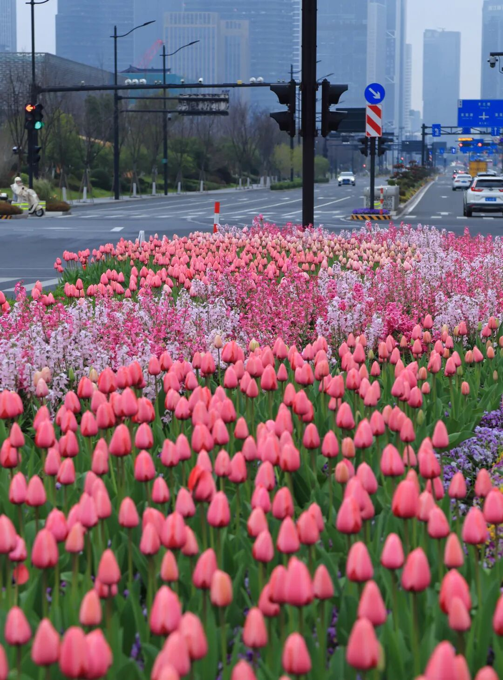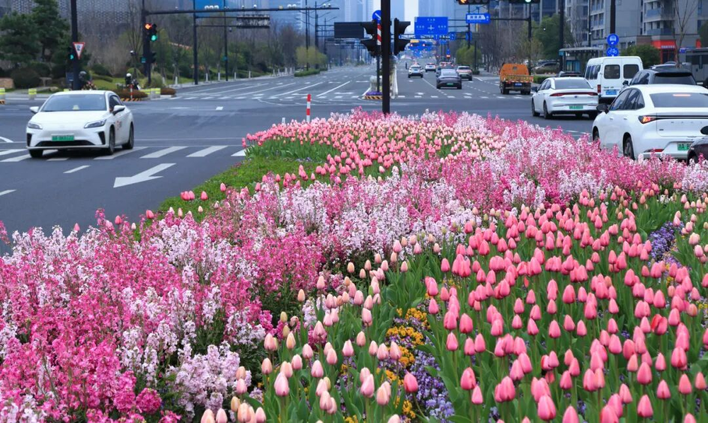 在人民日报点赞之前,“杭州的绿化带是要办婚礼吗?”的话题已在社交媒体刷屏。萧山盈丰街道的机非绿化带、中央隔离带端头,粉红、粉紫、嫩黄等色彩的郁金香沿着曲线铺展,搭配周边绿植,营造出精致花园感。