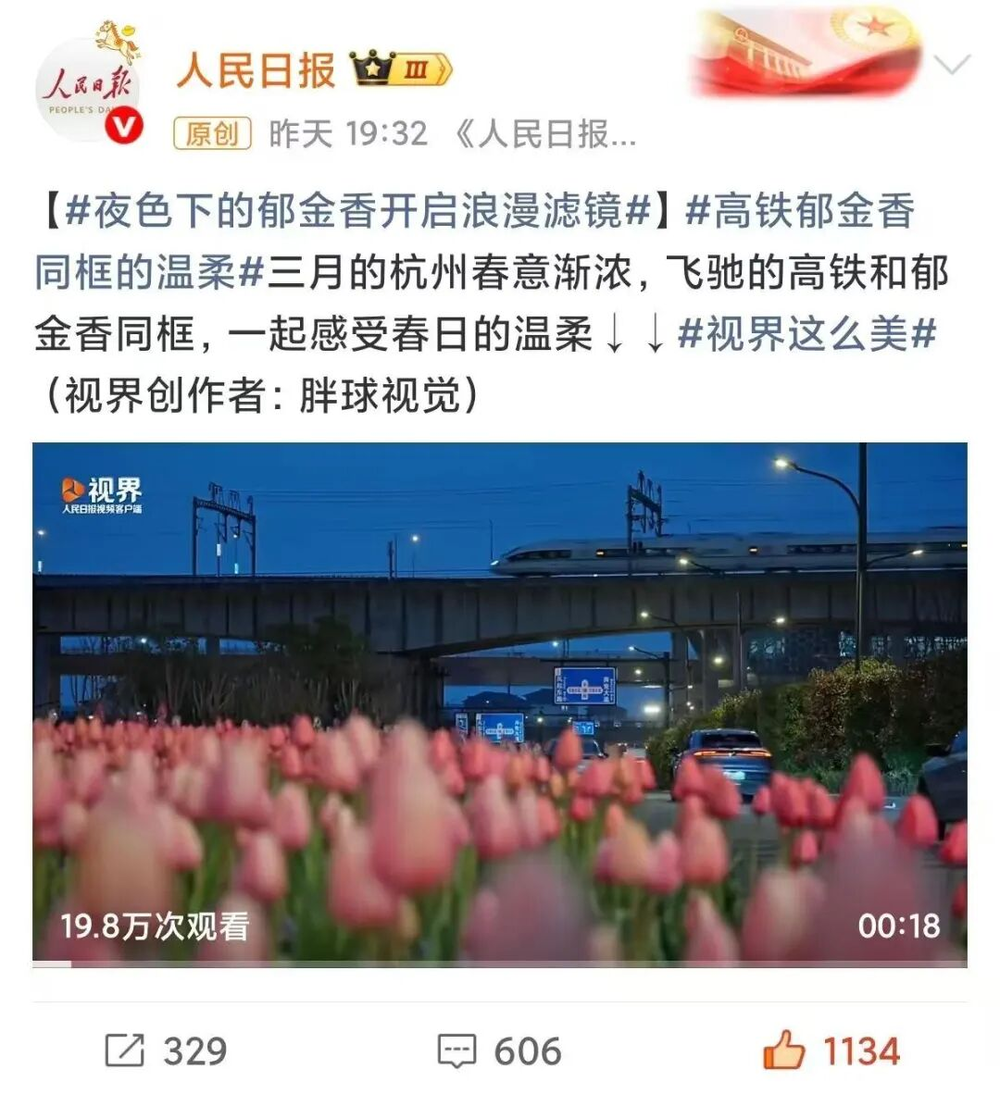 《人民日报》官方点赞绿化带郁金香截图
