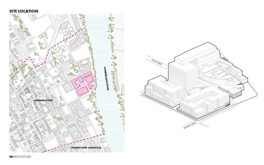 建筑师们详细介绍了场地历史,这是项目的核心概念支柱。他们表示:“坎伯兰河畔的诺伊霍夫区原有砖砌建筑与纳什维尔共同成长。1905年成立的诺伊霍夫包装公司曾将牲畜、人员和就业机会带到河岸,成为纳什维尔的地标。”1977年肉类加工厂关闭后的几十年里,当地艺术家和音乐家把这里当作家园。据官方信息,诺伊霍夫区曾是纳什维尔爵士工坊、纳什维尔文化艺术项目以及多个录音和摄影团体的所在地。建筑师们认为,场地的文化意义、独特建筑风貌与历史,以及最重要的河岸位置,使其成为“黄金地段”。该项目由美国佐治亚州的房地产开发商新城市地产公司牵头。