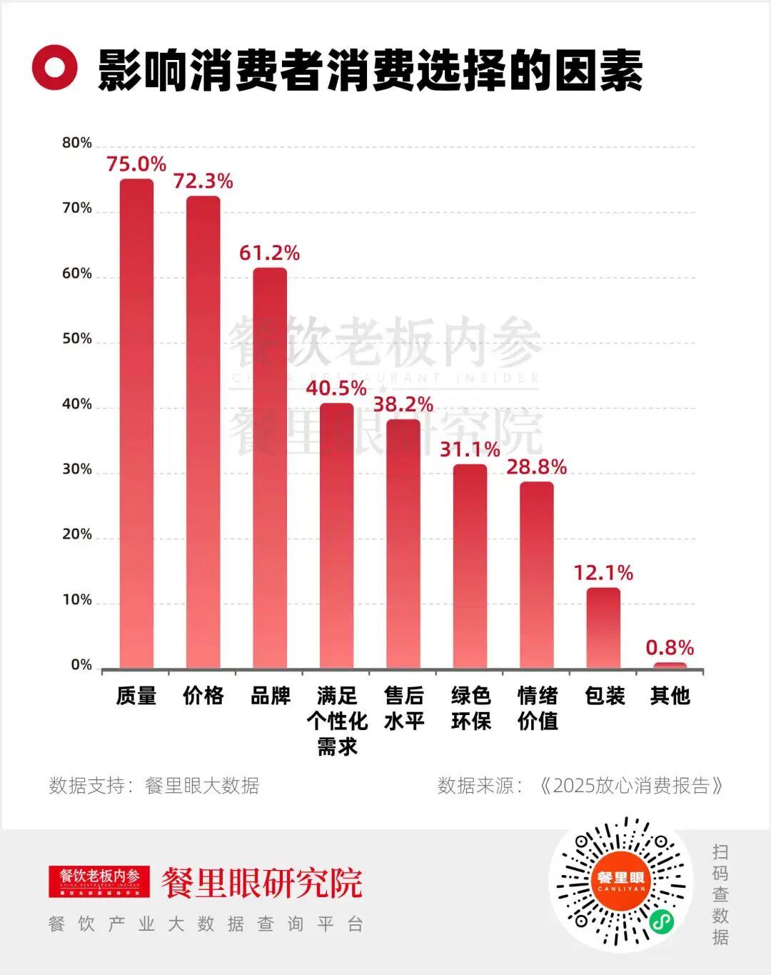《2025放心消费报告》显示,消费者更关注质量(75.0%)和综合价值,不再“唯低价论”。酸菜鱼等单品热度回落,单一爆款时代结束;健康需求未被充分满足,供需错配成破局机遇。