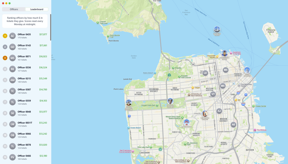 于是他写了个爬虫,每隔几秒检查一次数据库里最新的序列号,以极低的API请求频率近乎实时抓取每一张新罚单,再结合苹果地图API,做成了名为“Find My Parking Cops”的网页应用。这导致旧金山市民都能在地图上实时看到每位停车警察最后一次开罚单的精确坐标。