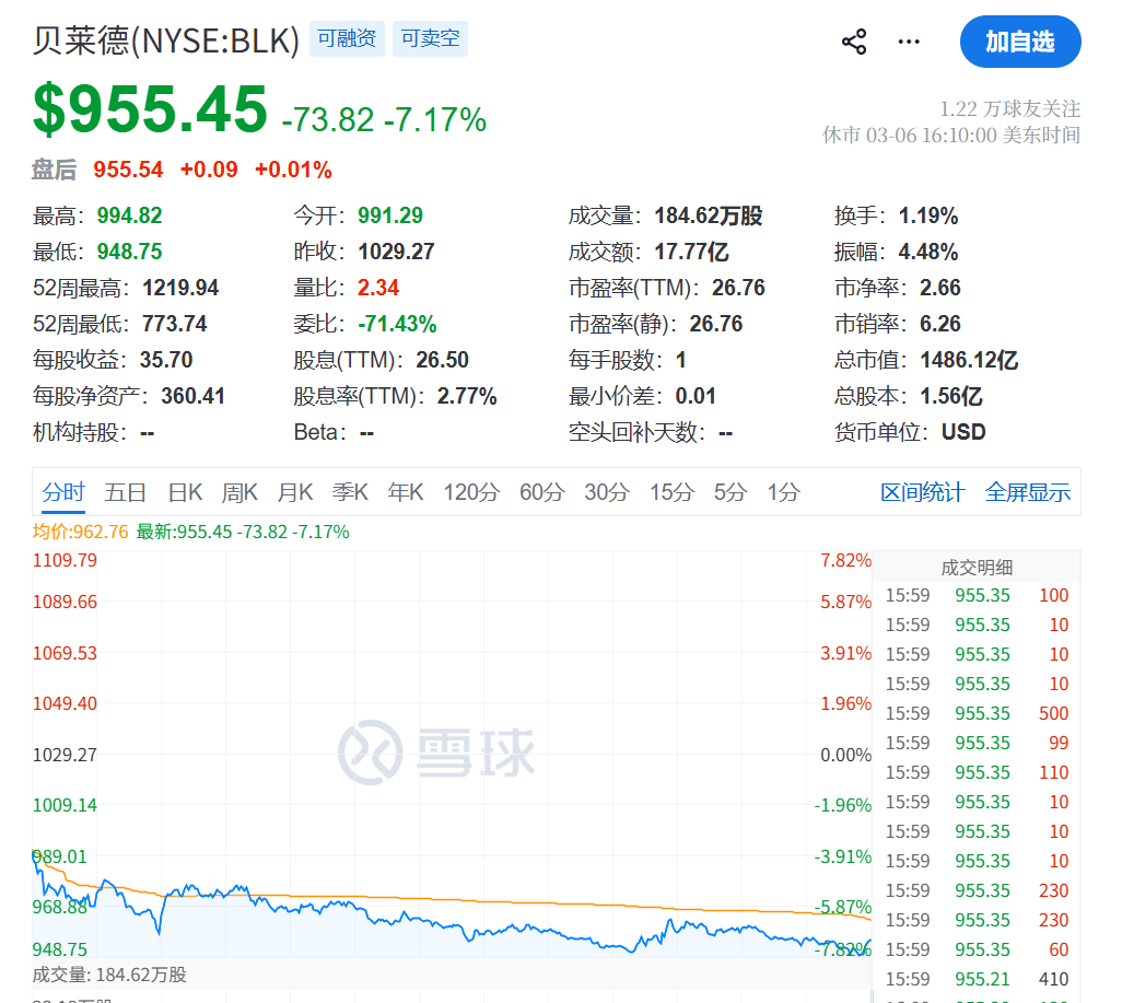 隔夜美股交易中,全球最大资产管理公司贝莱德的股价出现7%的大幅下跌。