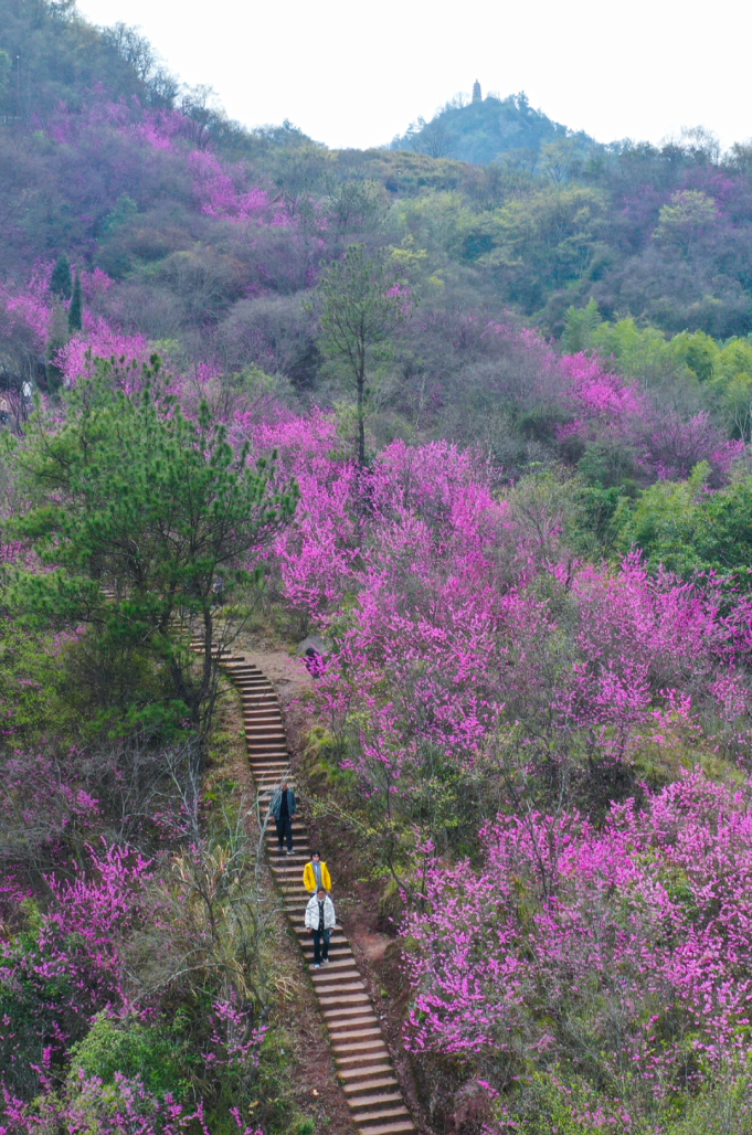 富岭巾山千亩紫荆花三月绽放,吸引游客赏花爬山。