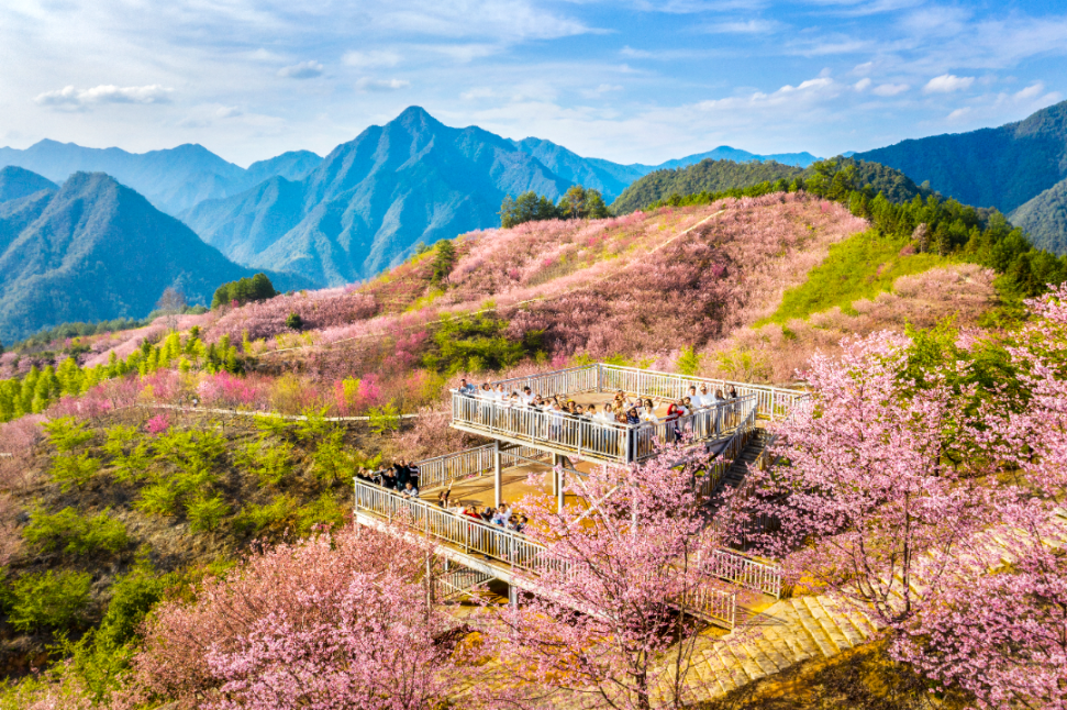 住龙镇樱花谷千亩樱花盛花期,粉白花海吸引游客赏樱打卡。