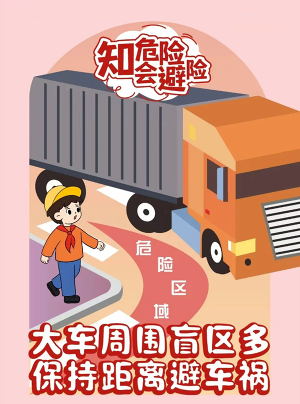 大型车辆存在视觉盲区,行人与非机动车经过路口时,不要抢先超越正在转弯的大型车辆,务必与其保持足够安全距离,远离盲区才能平安通行。