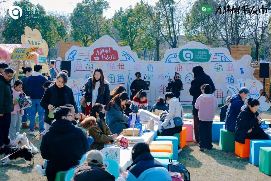 昨日恰逢“三八”国际妇女节,奉贤的九棵树(上海)未来艺术中心迎来了一场别开生面的户外活动,吸引了不少女性朋友参与。这里没有严肃的舞台演出,取而代之的是草坪上尽情撒欢的狗狗,以及专注于手工创作的宠物主人们。艺术中心特意为女性宠物主人策划了这场“姨姨手工日”市集,让女性朋友们能和自己的“毛孩子”一同,在手作体验、音乐氛围与社交互动中,度过一个轻松惬意又温馨满满的节日。
