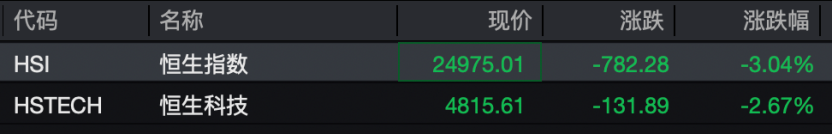港股市场方面,主要指数同样走低。截至发稿,恒生指数跌破25000点,跌幅超过3%;恒生科技指数一度跌超3%,目前跌幅收窄至2.67%。
