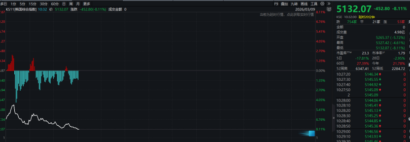 韩国股市同样大幅下挫,韩国综合指数盘中跌幅超过8%,并触发了熔断机制。自本轮中东冲突升级以来,韩国股市已多次触发熔断,累计回撤幅度接近20%。