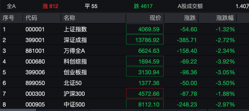 3月9日当天,A股三大指数集体低开。截至发稿时,上证指数下跌1.32%,深证成指下跌2.72%,创业板指下跌3.05%,科创综指下跌3.92%,北证50指数下跌3.5%。全市场有超过4600只股票出现下跌。
