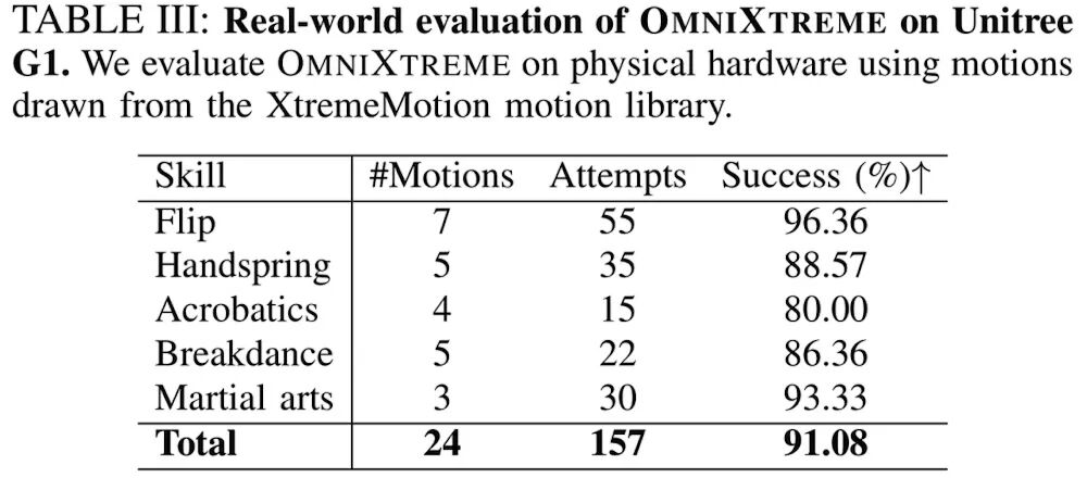 该框架使机器人能通过一套统一策略完成后空翻、托马斯全旋、武术踢击等多种高动态动作,在真实机器人上的成功率超过90%。