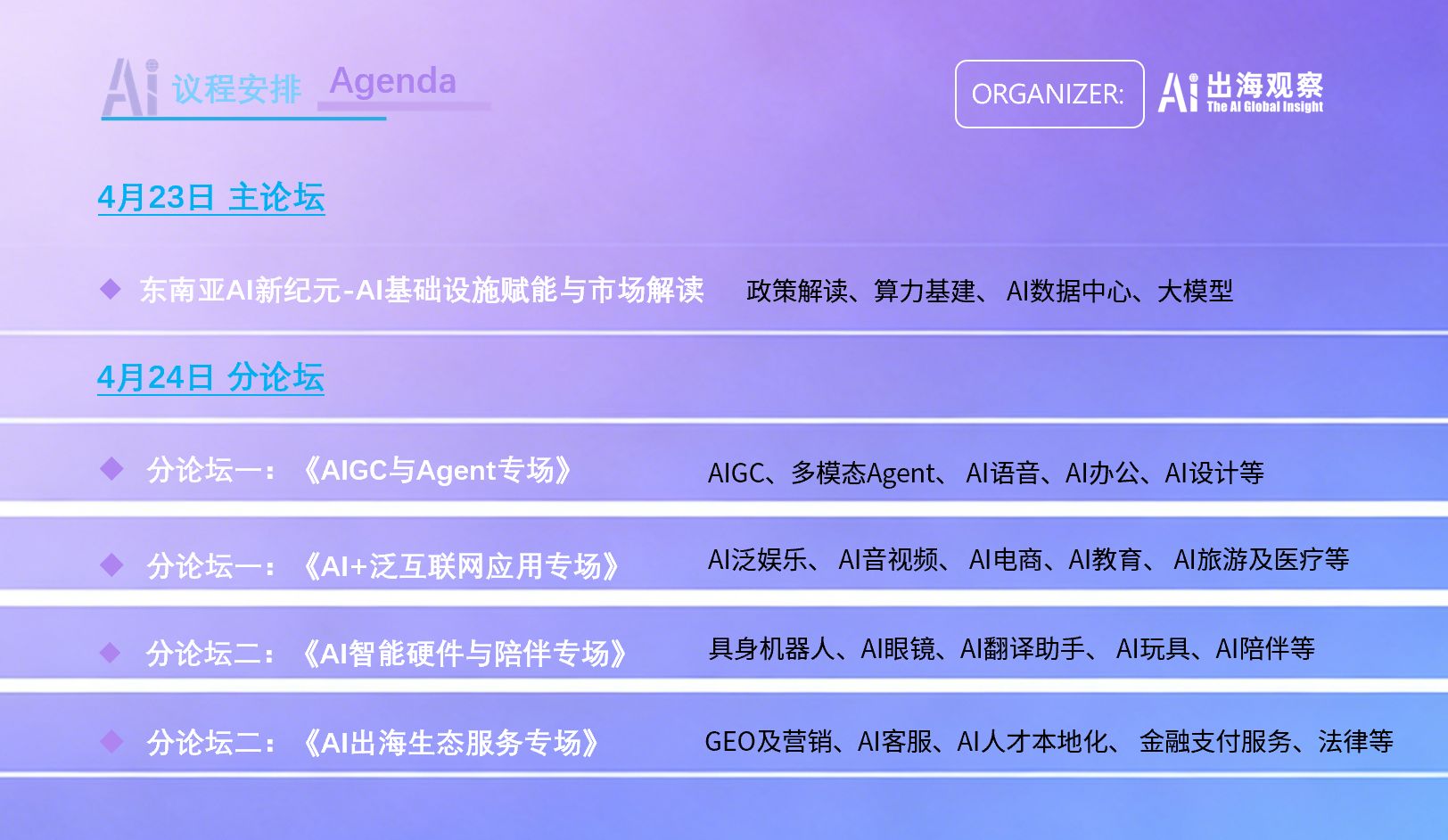 在此背景下,4月23-24日,AI出海观察联合泰国本地资源及AI行业伙伴,在曼谷举办2026东南亚AI应用出海峰会。峰会以“从出海,到扎根”为主题,聚焦企业从单纯产品推广转向解决本地实际问题的核心需求,针对合规、语言多样性、持续运营与增长、数据本地化、人才短缺等挑战,逐一拆解可行的落地方案与资源路径,助力破解AI出海落地“最后一公里”难题。