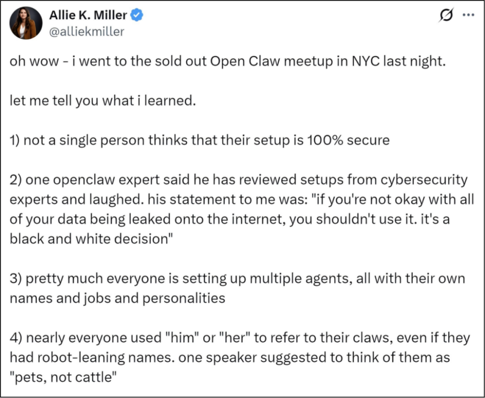 然而,一个关键问题随之而来:那些花钱请人安装小龙虾的用户,真的能用好它吗?2025全球AI领域百大影响力人物之一的米勒小姐,几天前参加了纽约的一场Open Claw聚会,她发现聚会上很多人的PPT都是由小龙虾撰写的。一位前金融从业者甚至骄傲地表示,自己通过小龙虾搭建了完整的股票交易平台,第一天就赚了300美元,但米勒小姐也指出,若没有多年的金融经验,盲目搭建平台可能会亏钱。