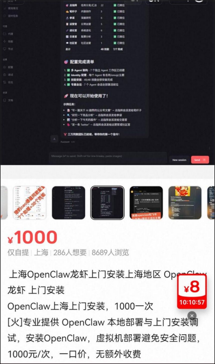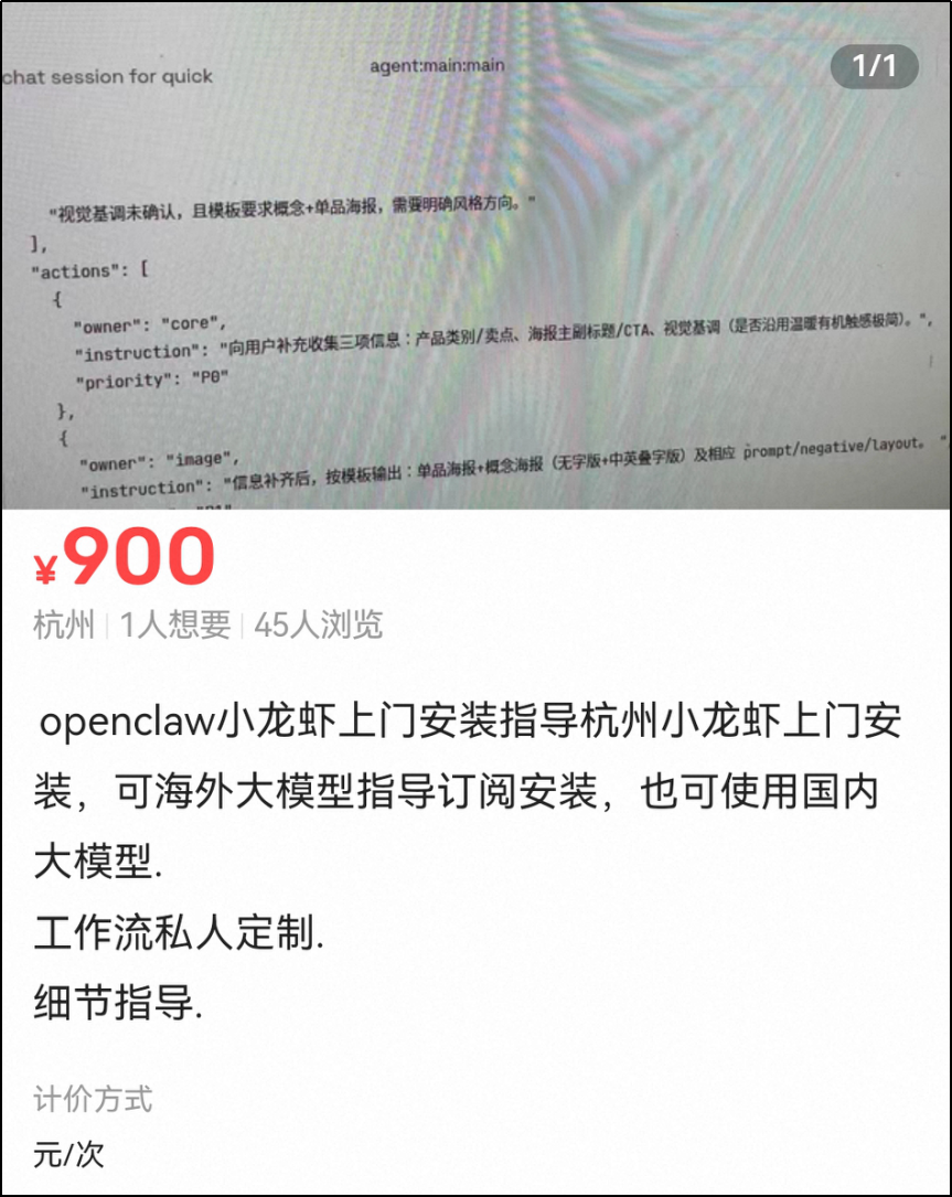 尽管Open Claw的安装部署流程简单,只需跟随基础教程即可完成环境配置,但许多人因担心错过时代风口、害怕被AI取代而产生焦虑,进而催生了“上门安装”的需求。在二手交易平台上,这项服务的价格从最初的五六十元一路飙升,先是五百元,随后涨到九百元,最终甚至突破了一千元。