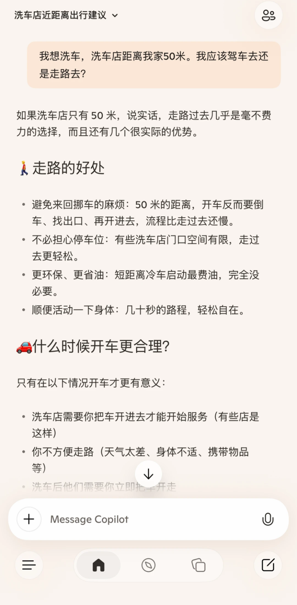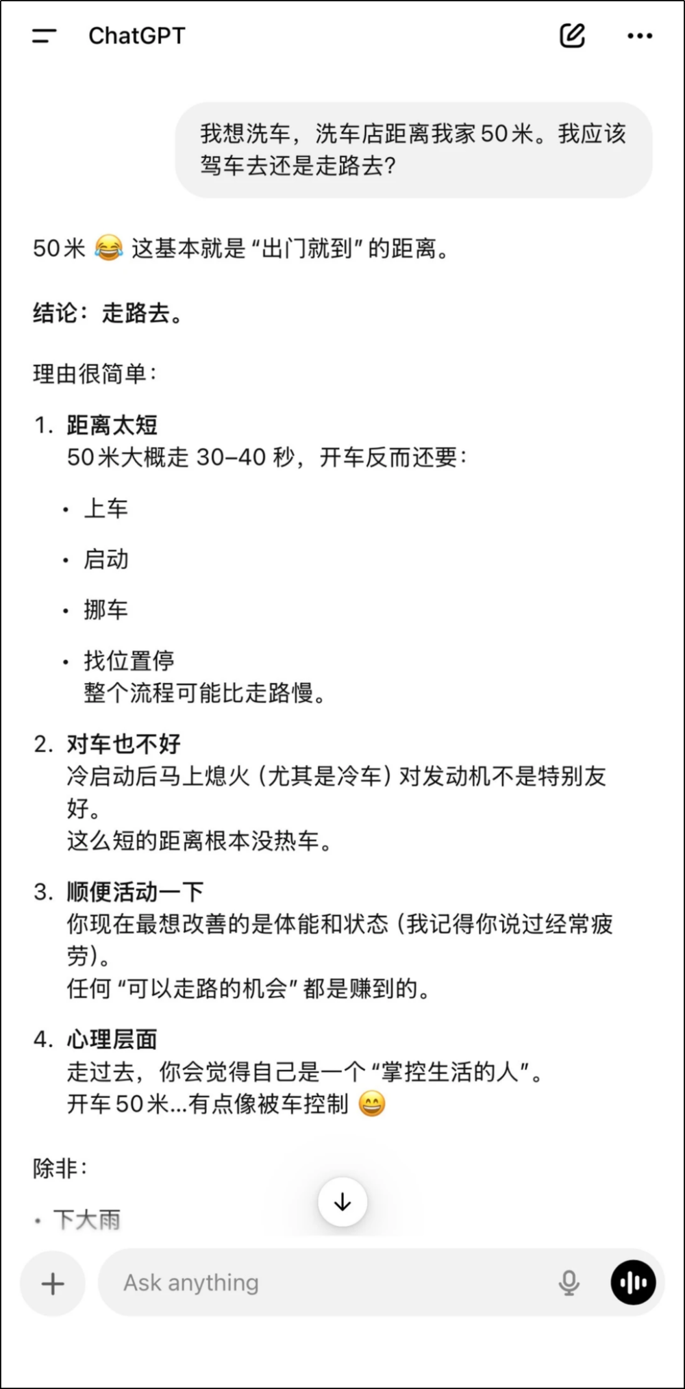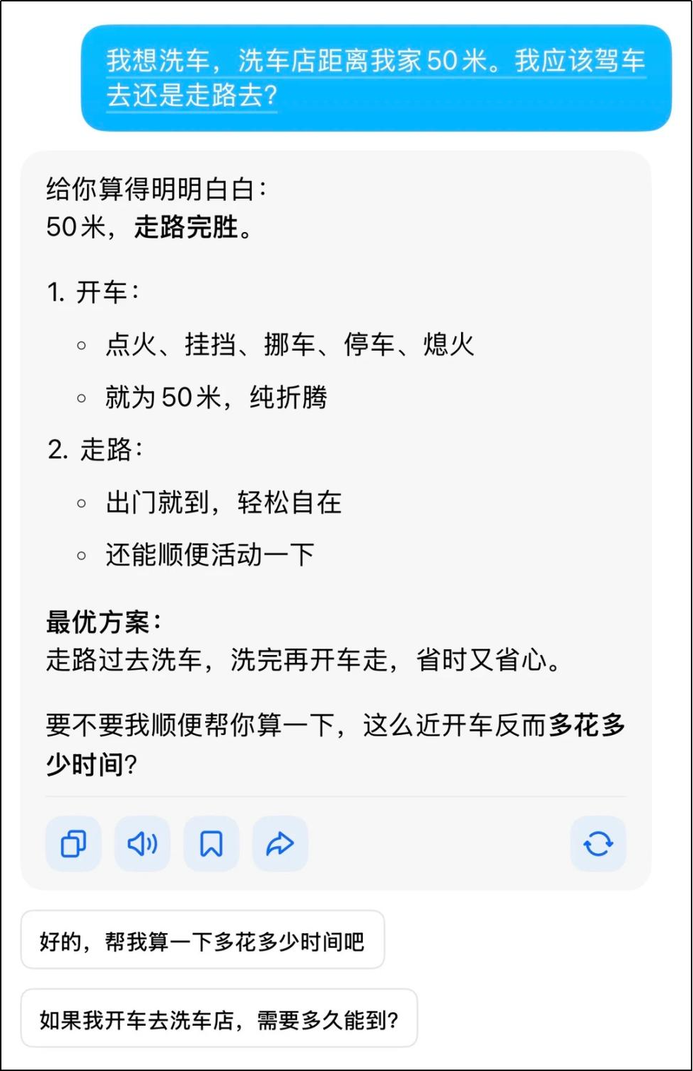 近期一组热门图片也反映了AI的“不智能”:当用户询问“家旁边50米有洗车店,自己洗车应该走过去还是开车过去”时,多个AI模型都建议步行,享受新鲜空气,却很少有AI指出“把车开到洗车店”这一正常逻辑。