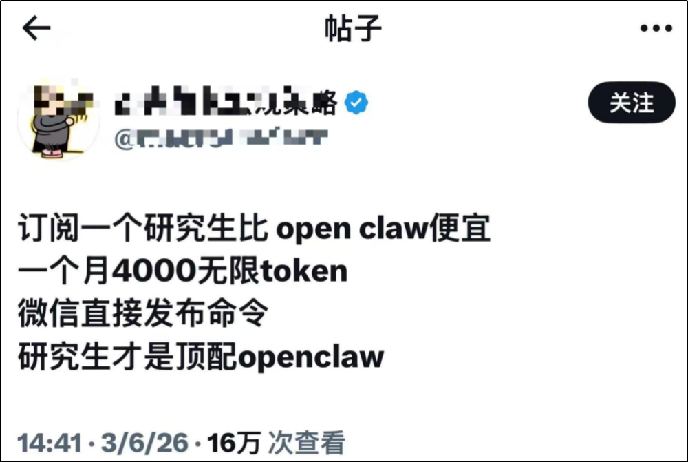 然而,许多人消耗大量token,却只是用来整理桌面文件,这虽然为AI算力的资本投入提供了理由,但也意味着小龙虾对普通人的实际意义并不大。当前社会面临的棘手问题是“缺活不缺人”,而小龙虾的目标是打造“一人公司”,让一个人通过AI生成多名虚拟员工,组成高效率团队——这无疑会进一步挤压就业机会。