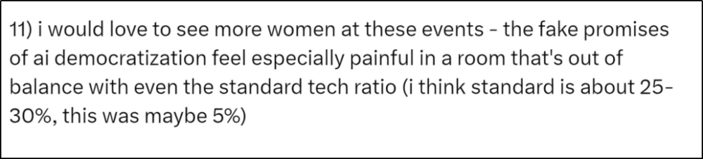 聚会上还有一个有趣的现象:几乎所有人都用“他”或“她”来指代自己的小龙虾,即便其名字带有机器人特征。有发言者甚至建议将它们视为“宠物,而非牲畜”。不过,米勒小姐也表达了自己的担忧:聚会上女性参与者的比例仅为5%,远低于她认为合理的25-30%,她将这种现象称为“人工智能民主化的虚假一面”。