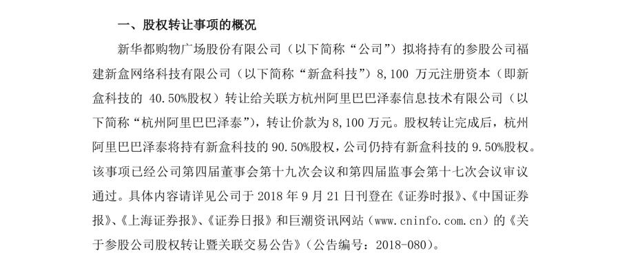 2018年4月,盒马在杭州开出首家自营门店,浙江业务开始转为直营;同年9月,新华都将新盒科技40.50%的股权转让给杭州阿里巴巴泽泰,2019年10月正式退出;2019年5月,高鑫零售宣布向上海润盒出售海南盒马全部股权;2022年6月,贵阳星力退出贵州星盒纵横,贵阳盒马收归直营。