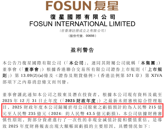 2025年,复星国际预计归属于母公司的亏损在215亿到235亿之间,亏损规模较上一年大幅扩大,甚至将2020年以来的归母净利润全部抵消。