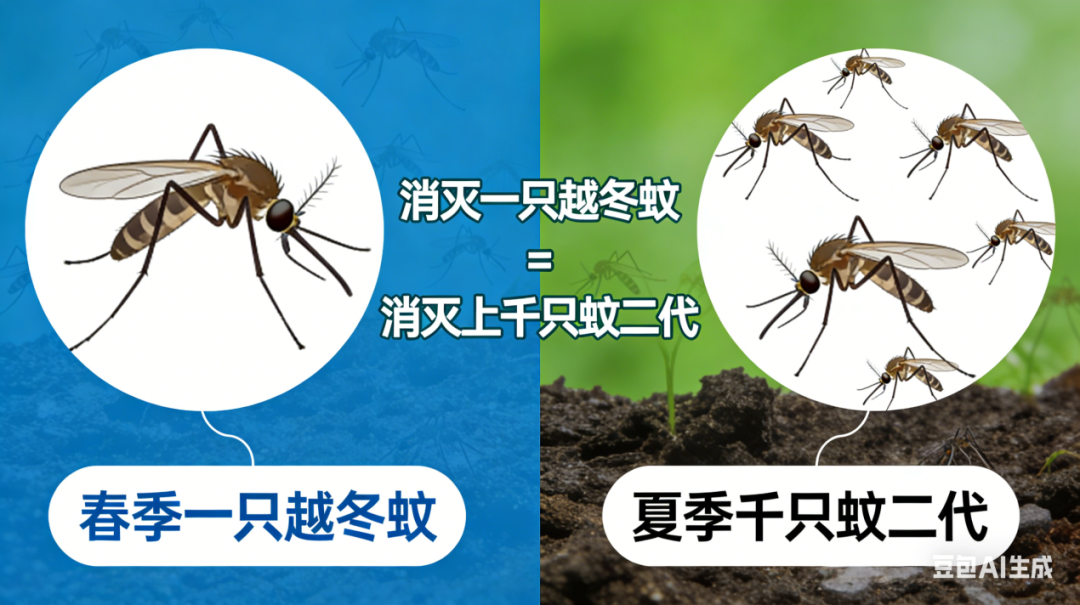 随着春季气温回升,这些“潜伏者”会逐渐“苏醒”并开始繁殖。消灭一只越冬蚊,就相当于消灭了上千只“蚊二代”!
