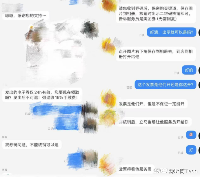 图:商家客服关于某自助餐厅商品售卖信息的对话。来源:小红书 《听筒Tech》截图