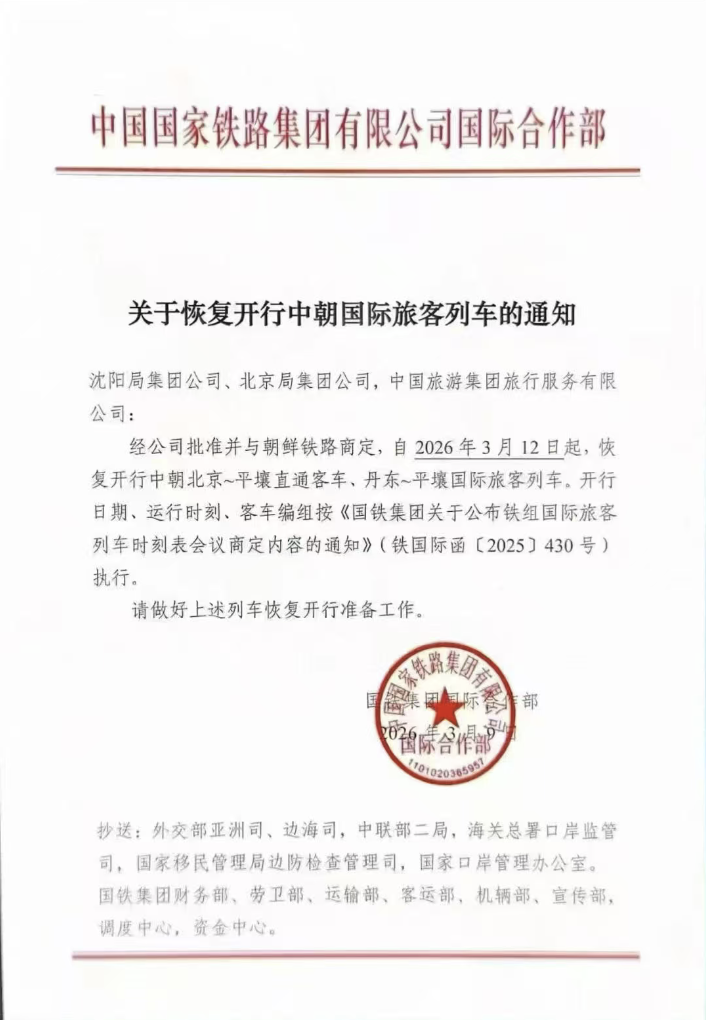国铁集团国际合作部发布的《关于恢复开行中朝国际旅客列车的通知》显示,自2026年3月12日起,北京-平壤直通车、丹东-平壤国际旅客列车将恢复开行。