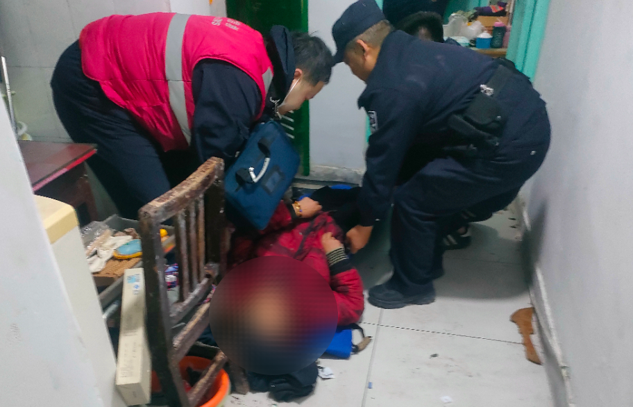 房门打开的那一刻,揪心的场景出现在眼前:老人倒在冰冷的地板上,意识模糊,说话也含糊不清。