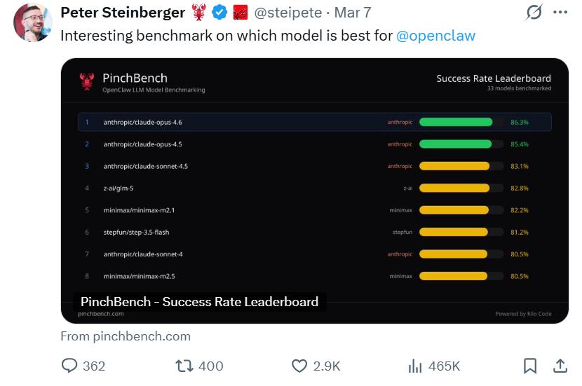 最近,OpenClaw创始人Peter Steinberger发布了一份名为PinchBench的基准测试榜单。