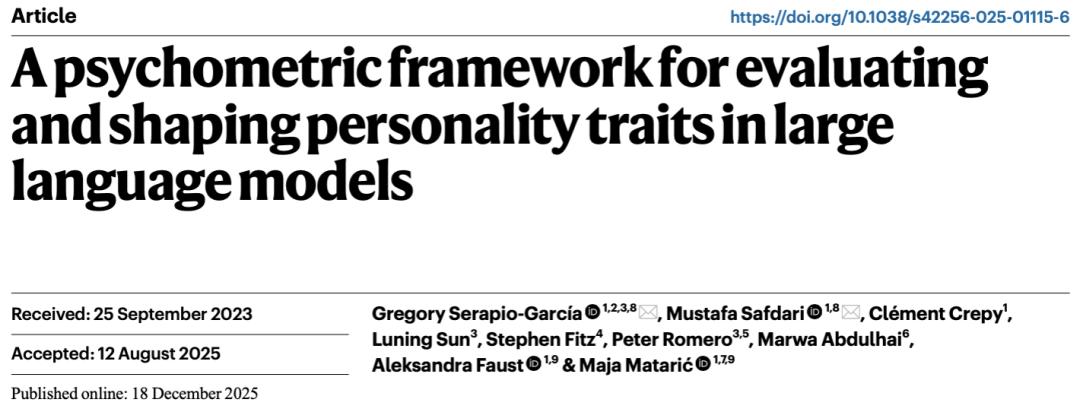 剑桥大学的另一项研究《用于评估与塑造大语言模型人格特质的心理测量学框架》,采取了更清醒的操作主义路径。