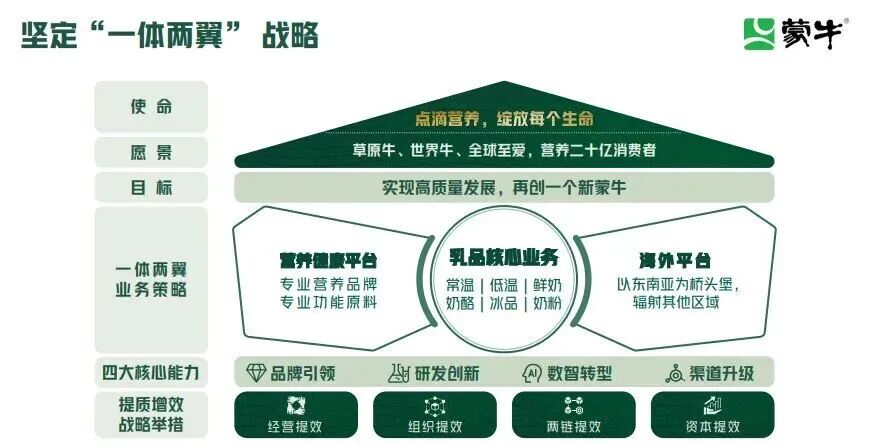 其次是“一体两翼”,战略聚焦。2024年中期业绩会上,高飞提出“一体两翼”战略:“一体”保证液态奶、奶粉、冰品、奶酪等核心业务稳健运行;“两翼”指创新业务(营养健康平台,布局专业营养和功能营养)与国际化拓展(整合海外资产)。该战略初见成效,2025年鲜奶、奶粉、奶酪等品类实现双位数增长,业务结构趋向多元。