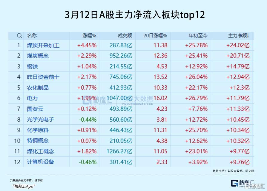 截至收盘,煤炭开采板块涨幅达4.45%,煤化工板块涨幅接近2%,郑州煤电、兖矿能源、陕西黑猫、华电能源、潞化科技、金牛化工等十多只个股涨停,多家龙头企业单日资金净流入均超过亿元。