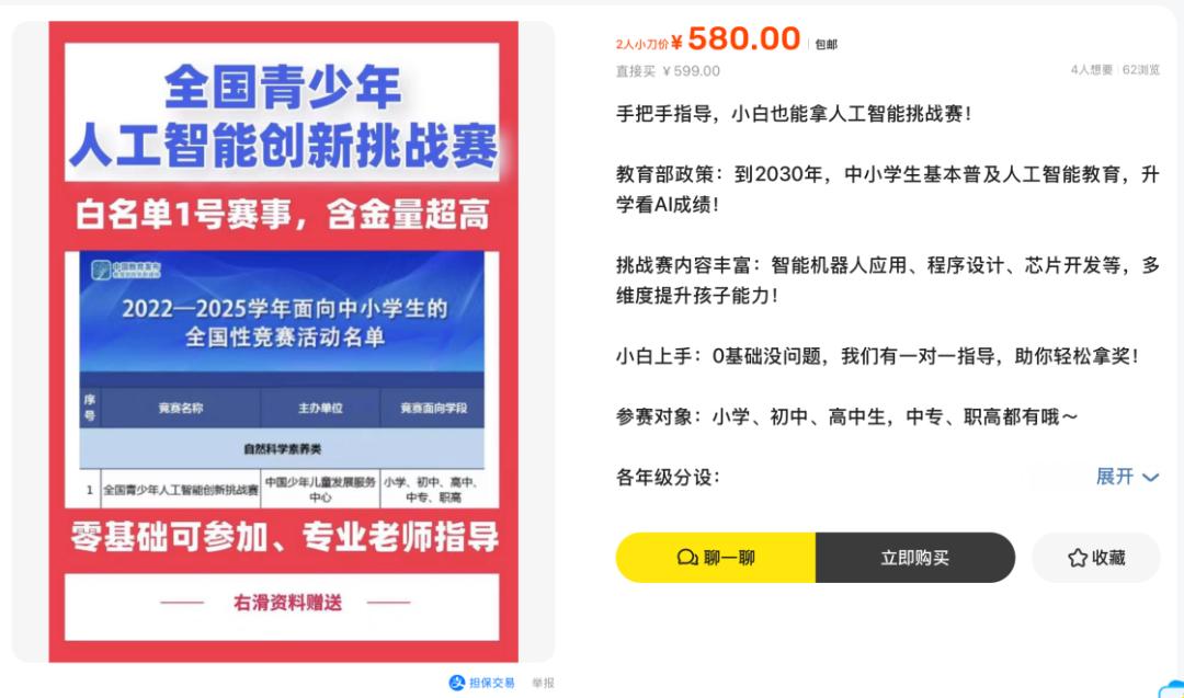 离开机构官网,深夜闲鱼藏着另一个世界。搜索“AI竞赛”,跳出的是包装精美的参赛方案,标价39.9元到12000元,标题满是暗示:“升学看AI”“含金量超高”“保送重点中学必备”。
