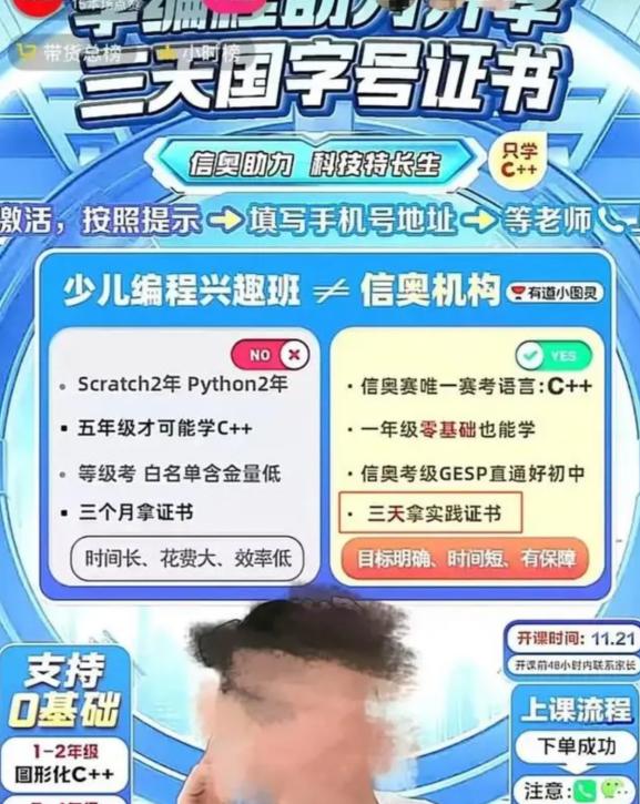 “现在不学AI,十年后孩子找不到工作”“错过比赛,小升初少筹码”等话术在家长群传播。70后、80后家长对AI熟悉又陌生,认知鸿沟成不良机构掩护。