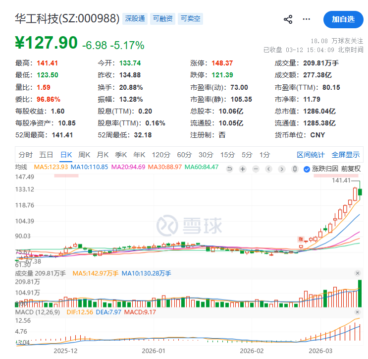 3月12日,光模块领域的核心企业华工科技早盘一度冲高至135.71元,创下历史新高,尽管随后有所回落,最终收跌5%,收盘价仍达127.9元。